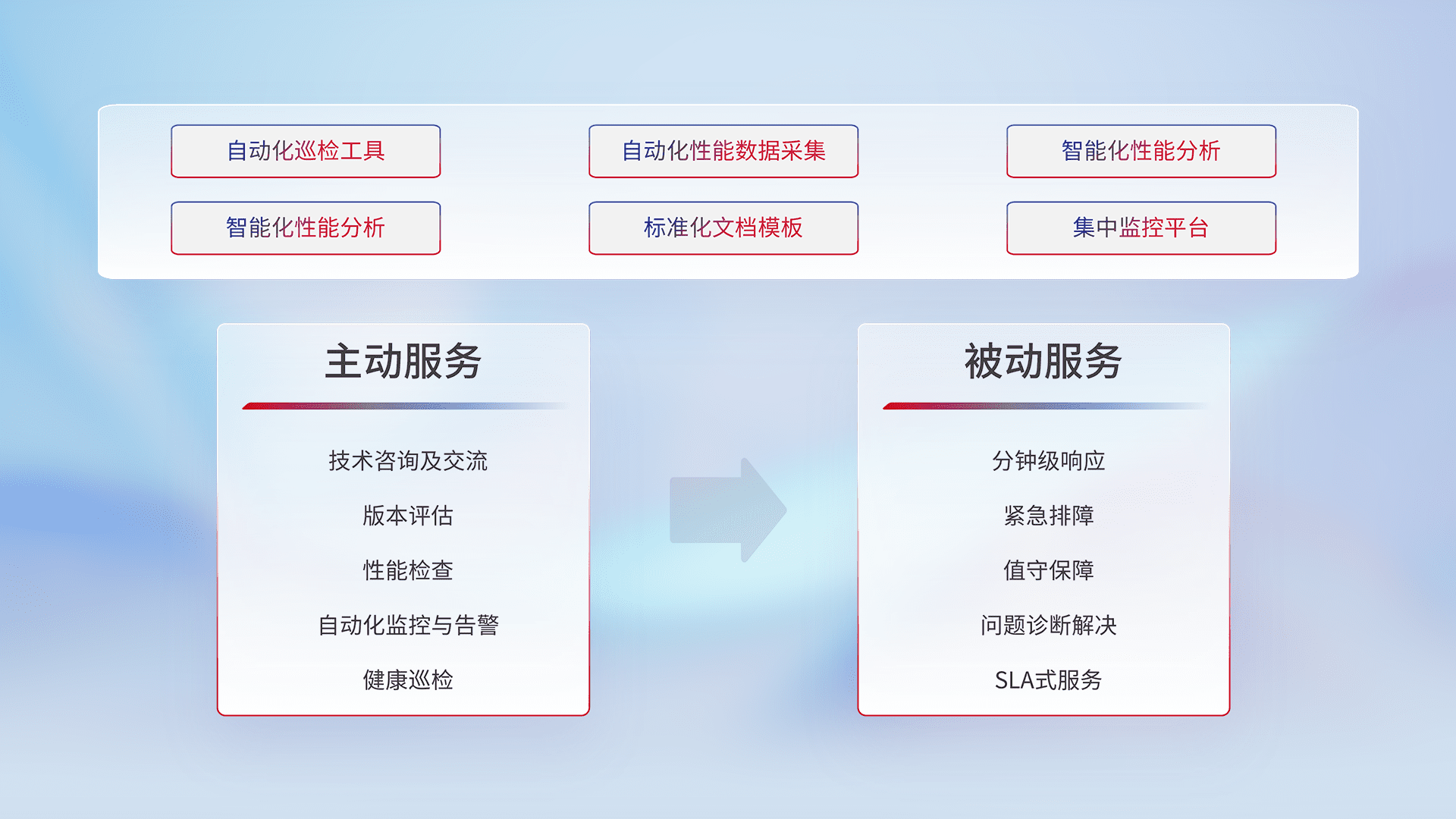 智能化工具和标准化文档,,保障服务质量,,,,提供主动服务(包含技术咨询、、、版本评估、、性能检查、、自动化监控与告警、、、、健康巡检)和被动服务包含(分钟级响应、、、、紧急排障、、值守保障、、、、问题诊断解决、、SLA服务)。。